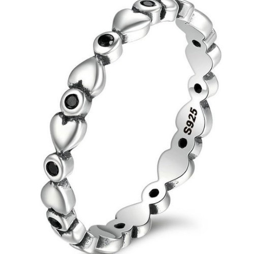 Strieborný dámsky prsteň posiaty drobnými čiernymi kryštálmi. Jeho šírka je 0,3 cm, váha 1,5 g.