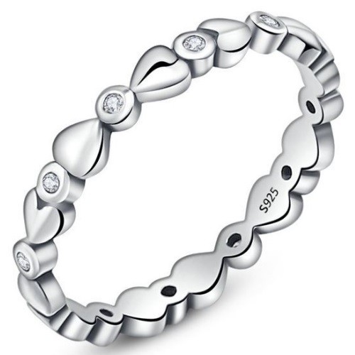 Strieborný dámsky prsteň posiaty drobnými bielymi kryštálmi. Jeho šírka je 0,3 cm, váha 1,5 g.