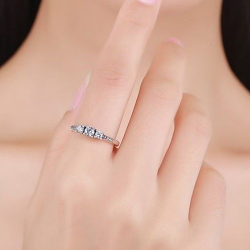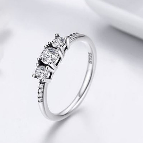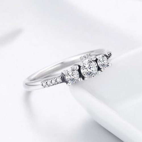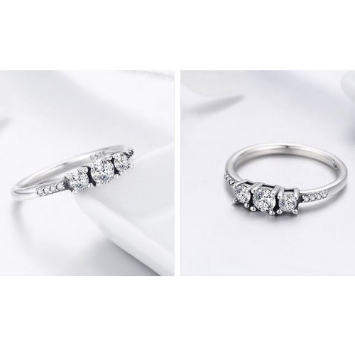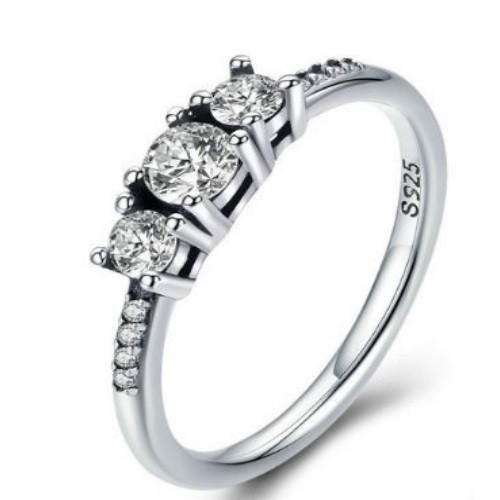 Dámsky strieborný prsteň zdobený tromi drobnými kryštálmi zirkónu. Jeho šírka je 0,2 cm, hmotnosť 2,1 g.