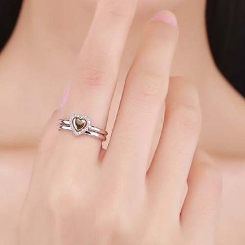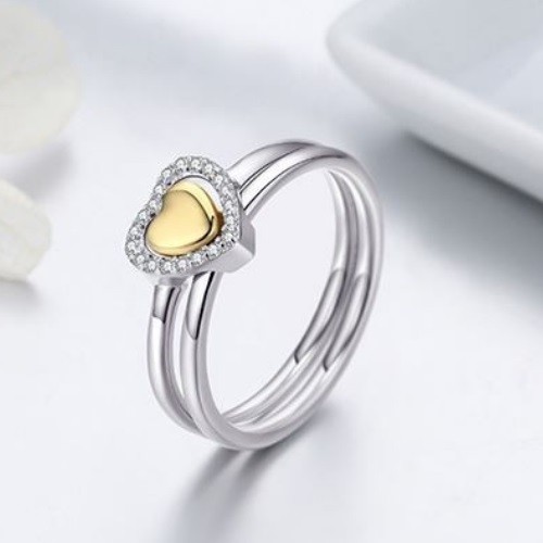 Dámsky strieborný prsteň zdobený srdiečkom vykladaným kryštálmi. Jeho šírka je 0,4 cm, hmotnosť 3,2 g.