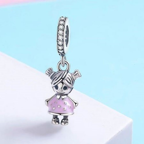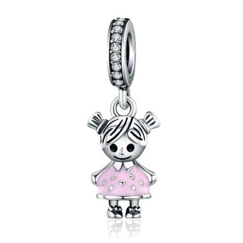 Prívesok znázorňujúci dievčatko v striebre, zdobený malými zirkónovými kamienkami. Na náramok alebo náhrdelník.