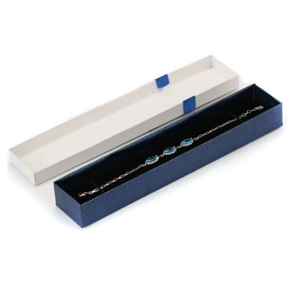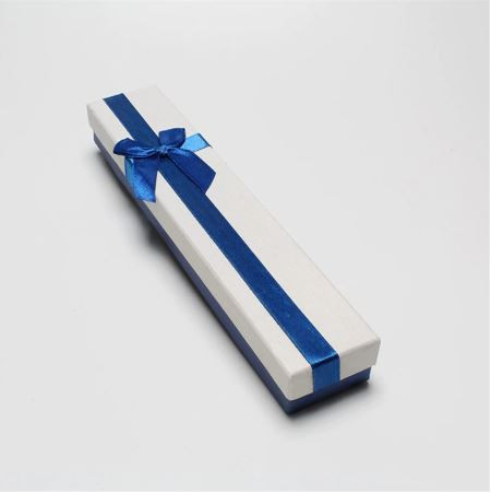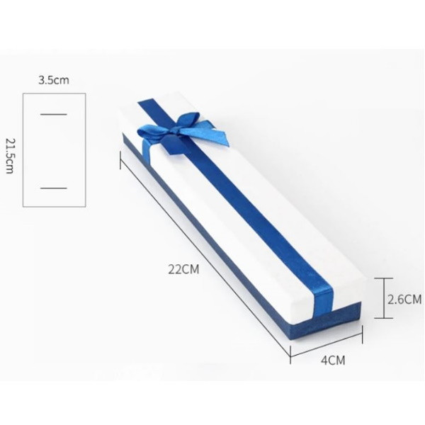 Elegantná biela šperkovnica s modrou mašľou. Váži 50-90 g. Jeho rozmer je 22 x 4 x 2,6 cm.
