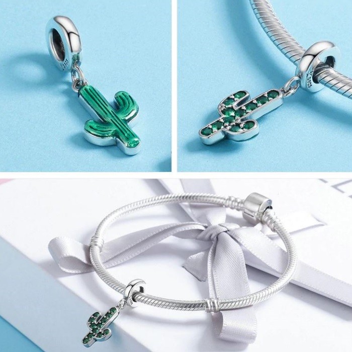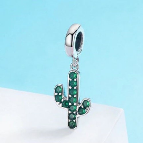 Kaktusový prívesok zo striebra, zdobený zelenými zirkónovými kamienkami, na náramok, náhrdelník.