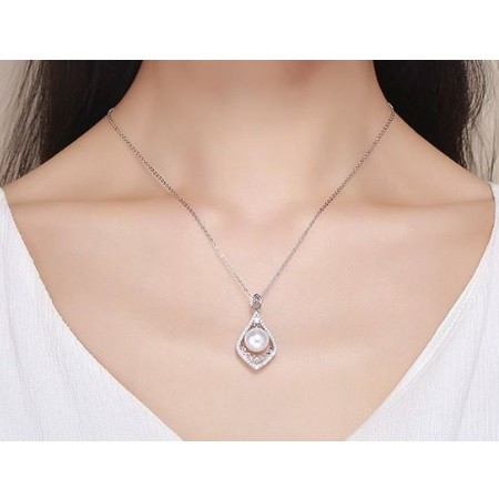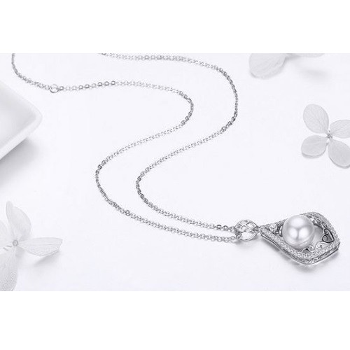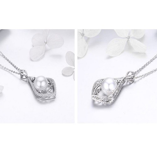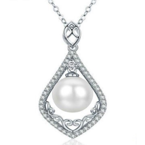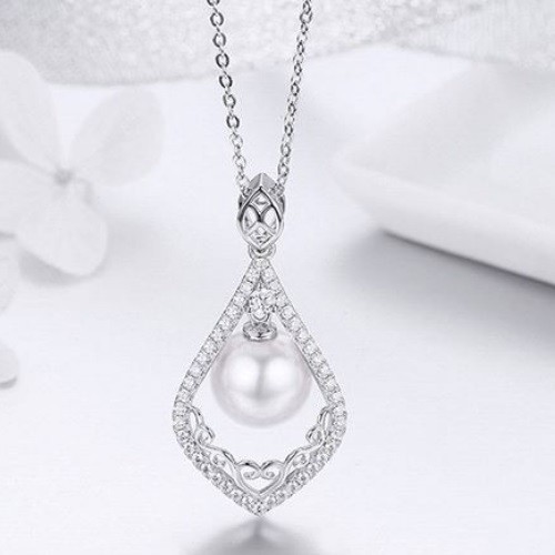 Prívesok v tvare slzy s krištáľom zdobený bielou pravou perlou, na striebornom náhrdelníku. Retiazka je dlhá 38-45 cm a váži 5 g. Veľkosť prívesku je 3,3 x 2,7 cm, perla 1 x 1 cm.