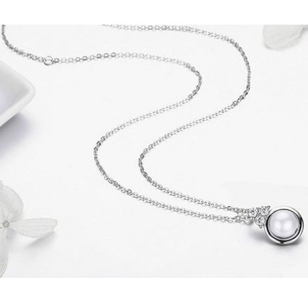 Okružný prívesok zdobený kryštálmi, vo vnútri s bielou pravou perlou, na striebornom náhrdelníku. Retiazka je dlhá 38-45 cm a váži 2,6 g. Veľkosť prívesku je 1,5 x 1 cm.