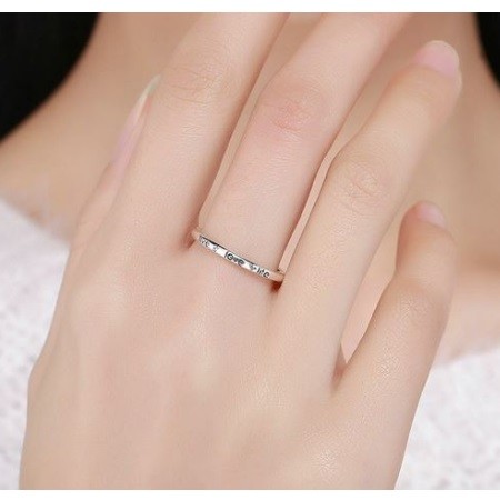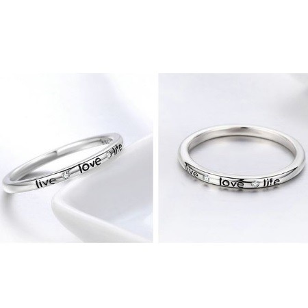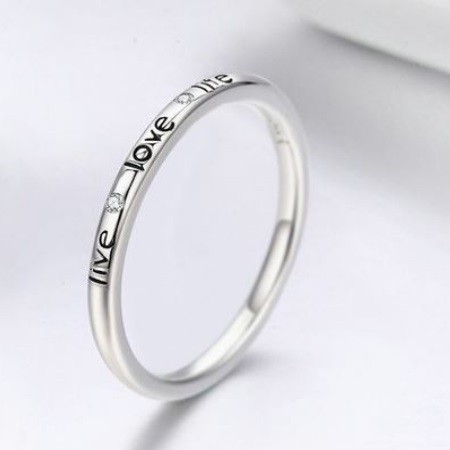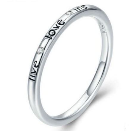 Dámsky strieborný prsteň zdobený nápisom Love a malými bielymi kryštálmi. Jeho šírka je 0,2 cm, váha 1,7 g.
