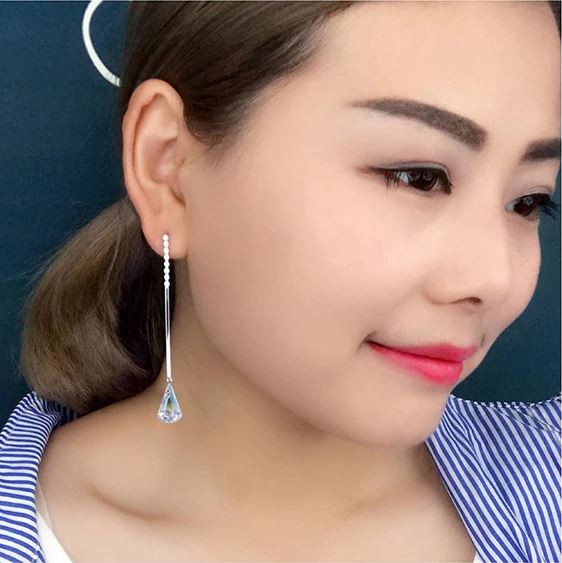 Dlhé, štíhle, visiace náušnice s trblietavými kryštálmi Swarovski. Jeho kovové časti sú vyrobené z nehrdzavejúcej ocele a zliatiny zinku. Jeho rozmer je 7,1 x 0,9 cm. Váži 4,50 g.