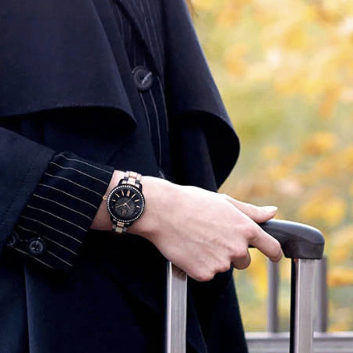 Dámske náramkové hodinky, s kovovým remienkom, čierno-ružovo-zlaté