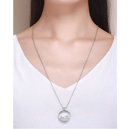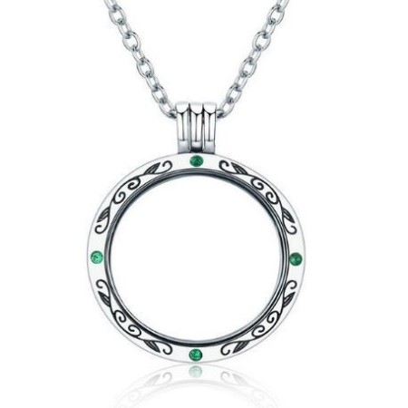 Otvárateľný prívesok zdobený malými zelenými kryštálmi na striebornom náhrdelníku. Retiazka je dlhá 38-45 cm a váži 13,9 g. Veľkosť prívesku je 3,1 x 2,5 cm.