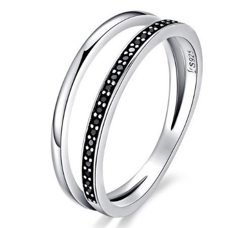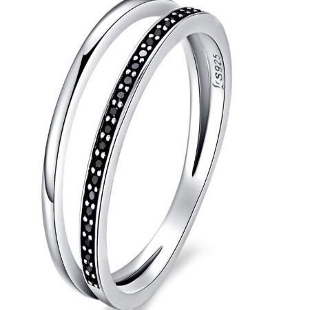 Dámsky dvojitý strieborný prsteň, zdobený čiernymi kryštálmi na jednej vetve. Jeho šírka je 0,6 cm, hmotnosť 1,9 g.