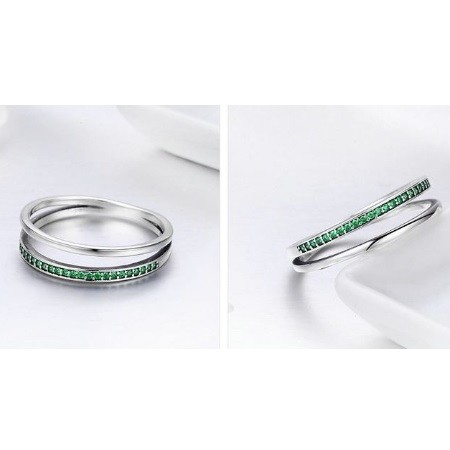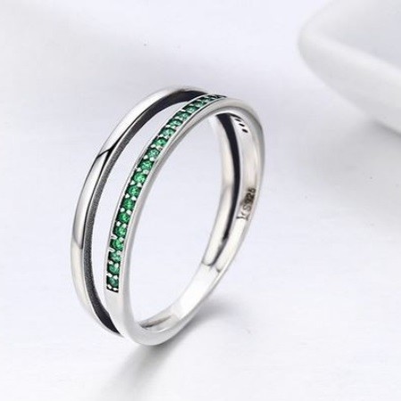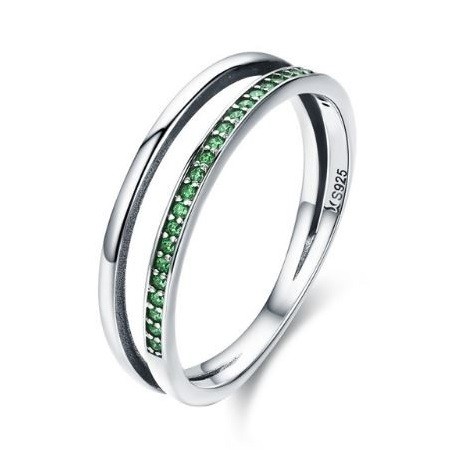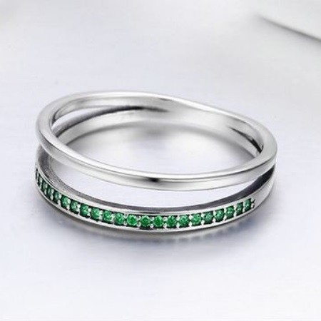 Dámsky dvojitý strieborný prsteň, zdobený zelenými kryštálmi na jednej vetvičke. Jeho šírka je 0,6 cm, váha 1,9 g.