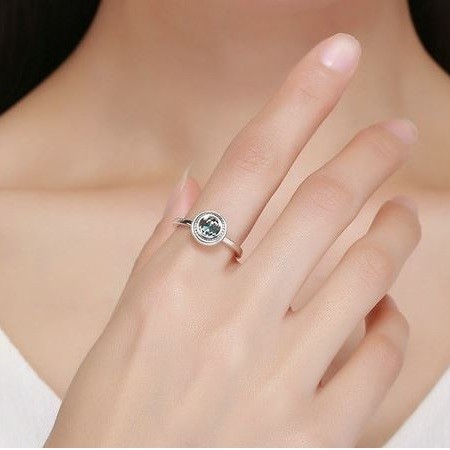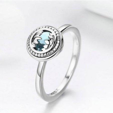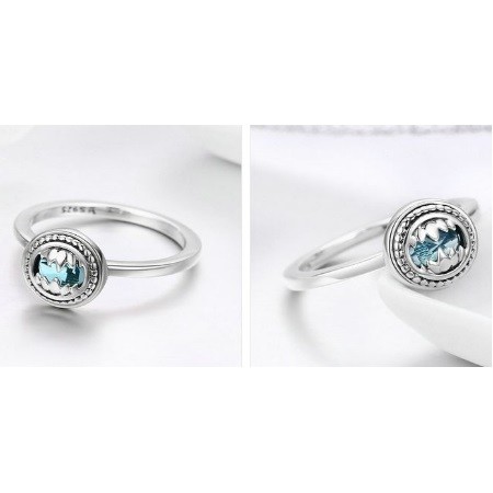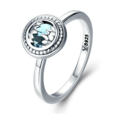 Transparentný, dámsky strieborný prsteň zdobený modrým kryštálom. Jeho šírka je 0,2 cm, hmotnosť 2,9 g.