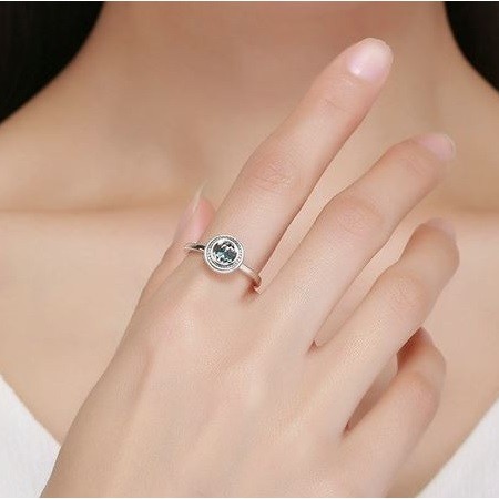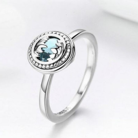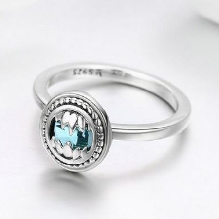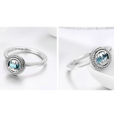 Transparentný, dámsky strieborný prsteň zdobený modrým kryštálom. Jeho šírka je 0,2 cm, hmotnosť 2,9 g.