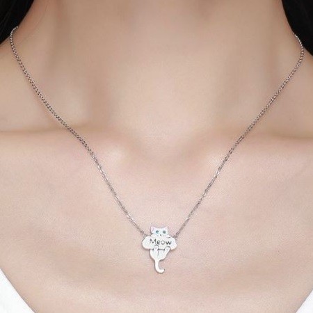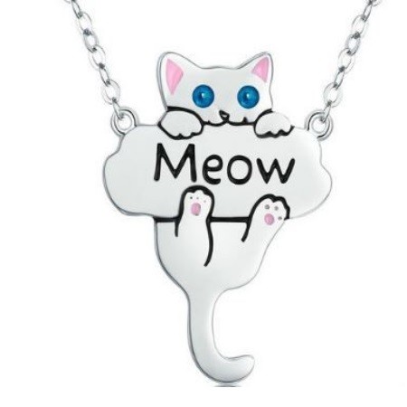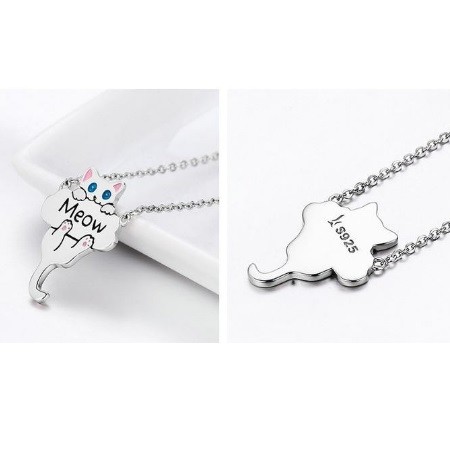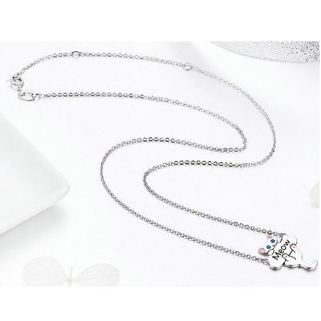 Strieborný náhrdelník, zdobený motívom mačky. Dĺžka retiazky je 38-45 cm, veľkosť prívesku 1,9x1,4 cm, váha 3 g.