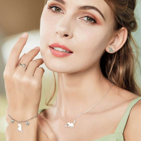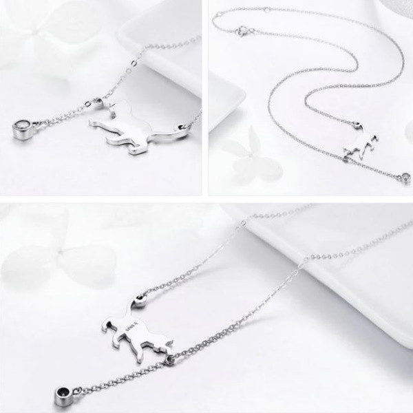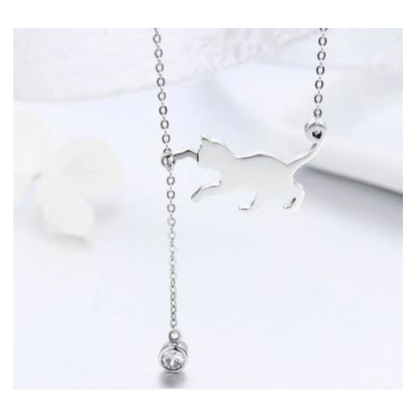 Náhrdelník vyrobený zo striebra, zdobený kryštálmi zirkónu, s príveskom mačička. Váži 3,2 g, rozmer prívesku je 1,4 x 2,5 cm.