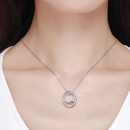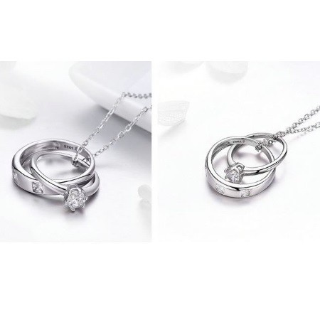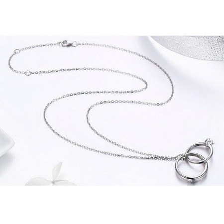 Strieborný náhrdelník s menším a väčším prsteňom ako prívesok, zdobený kryštálmi zirkónu. Dĺžka retiazky je 38-45 cm, veľkosť prívesku 2 x 1,8 cm, váha 3,9 g.