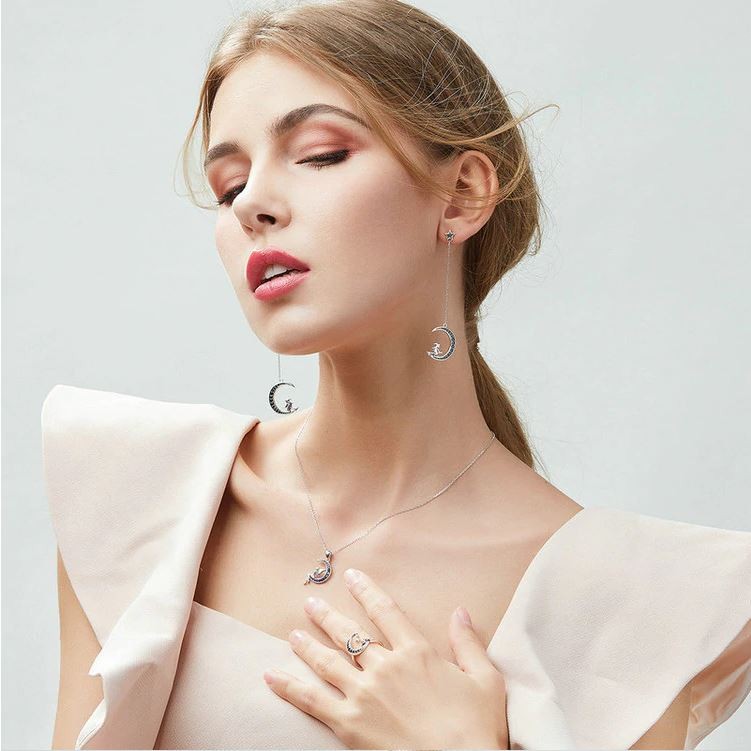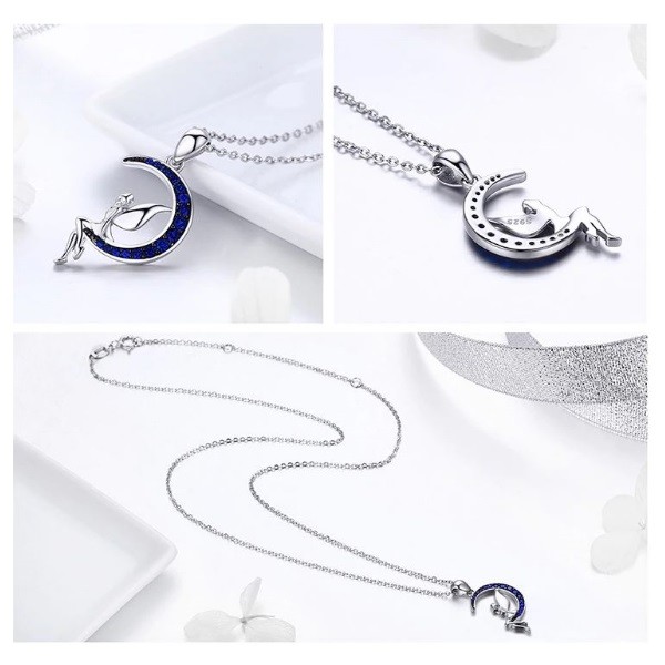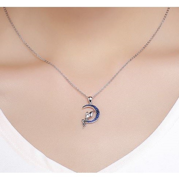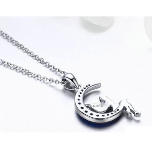 Strieborný náhrdelník s jemne vypracovaným príveskom, platinový povlak. Prívesok zobrazuje šťastnú vílu sediacu na mesiaci, mesiac zdobí trblietavý modrý krištáľ. Dĺžka retiazky je 38-45 cm, prívesok 2,6 x 1,4 cm. Hmotnosť 3,1 g