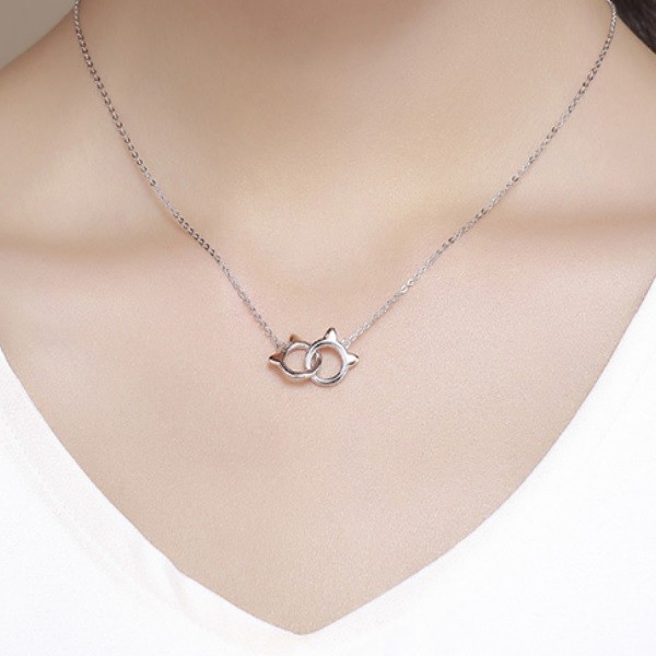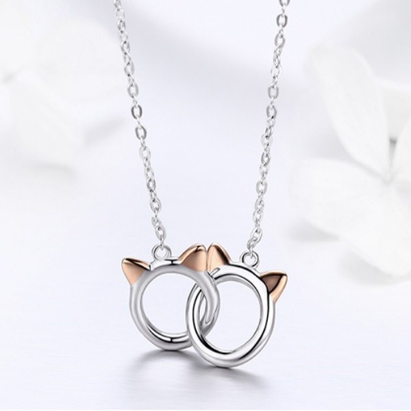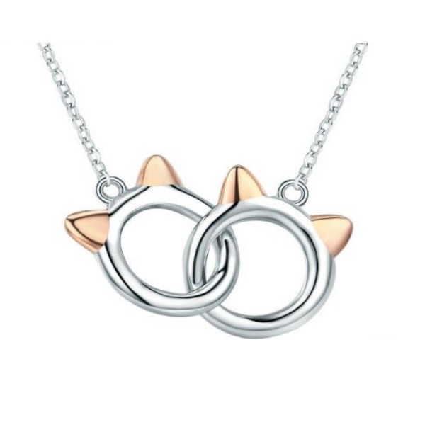 Strieborný náhrdelník s dvoma do seba zapadajúcimi príveskami hlavy mačky. Retiazka je dlhá 38-45 cm a váži 2,8 g. Veľkosť prívesku je 1,2 x 1 cm, potiahnutý ružovým zlatom alebo platinou.