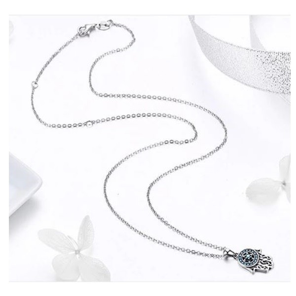 Strieborný náhrdelník s príveskom Hamsa, modrý kryštál
