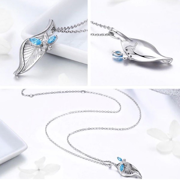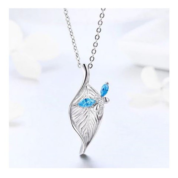 Strieborný náhrdelník s vážkou zdobený modrým zirkónovým kryštálom. Dĺžka retiazky je 38-45 cm, veľkosť prívesku je 2,6 x 1 cm.