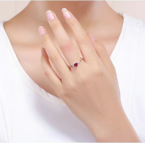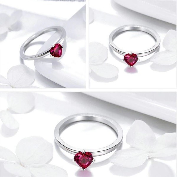 Elegantný strieborný prsteň so srdiečkom z červeného zirkónového kryštálu. Hrúbka prsteňa je 0,2 cm.