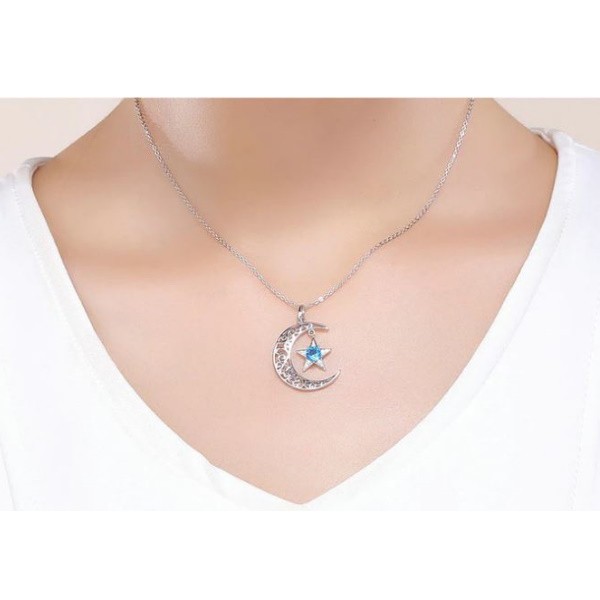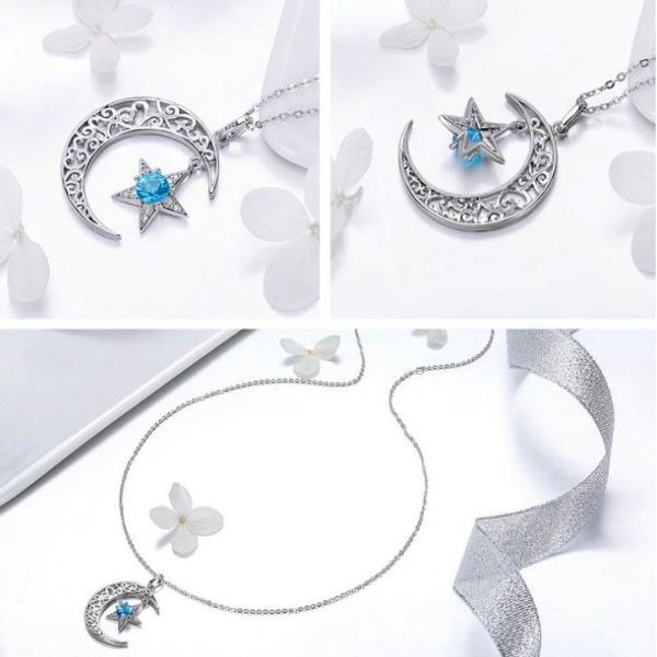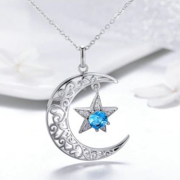 Náhrdelník zo striebra s príveskom znázorňujúcim slnko a hviezdu zdobený modrými zirkónovými kryštálmi. Dĺžka retiazky je 36-45 cm. Veľkosť prívesku je 3 × 2 cm.