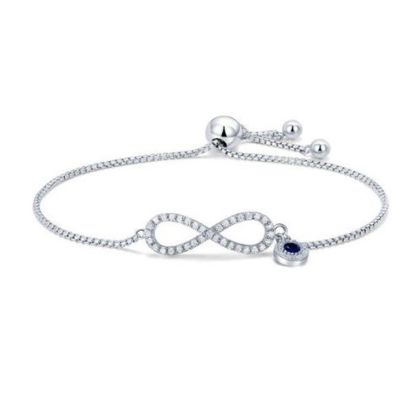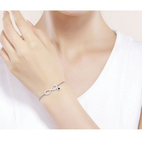 Strieborný náramok so symbolom nekonečna, bohato zdobený bielym zirkónovým kryštálom. Veľkosť motívu je 2,3 x 0,8 cm.