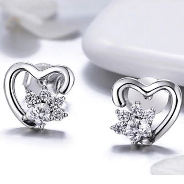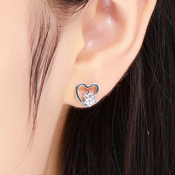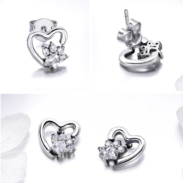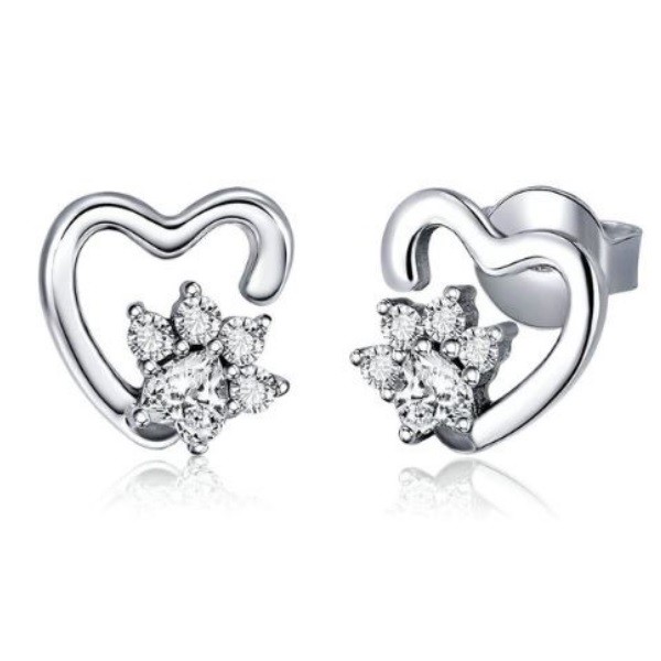 Náušnice zo striebra, zasúvacie. Psia labka zdobená bielym kryštálom zirkónu, obklopená v tvare srdca. Veľkosť 0,9 x 0,9 cm.