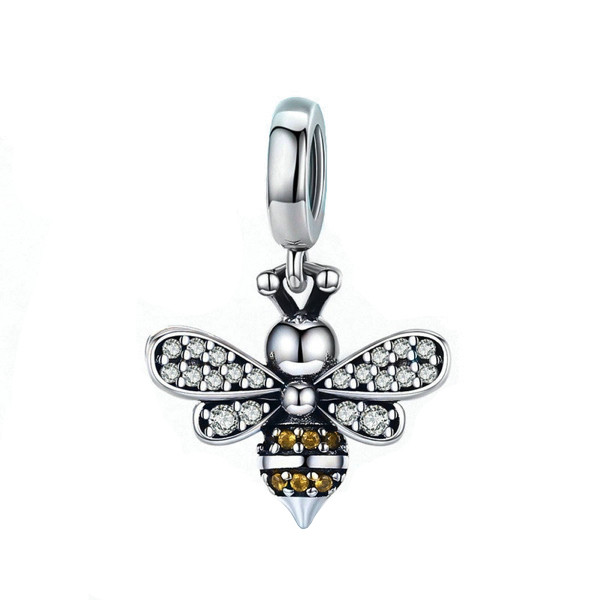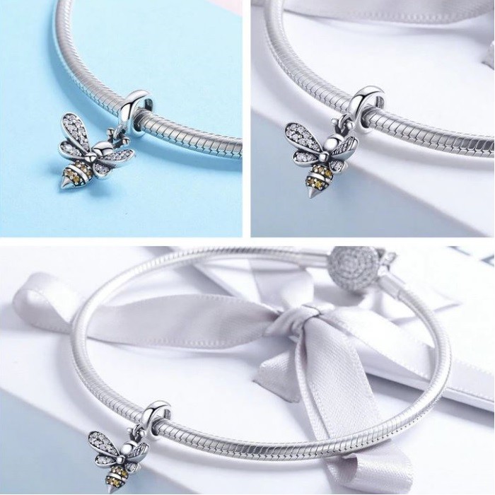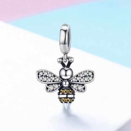 Včelíkový prívesok s drobnými bielymi a žltými zirkónovými kryštálmi, vyrobený zo striebra. Na náramok, náhrdelník.