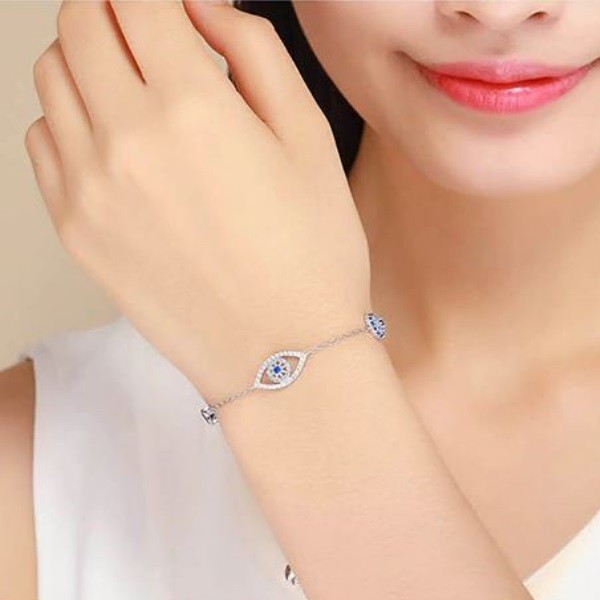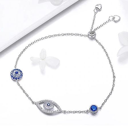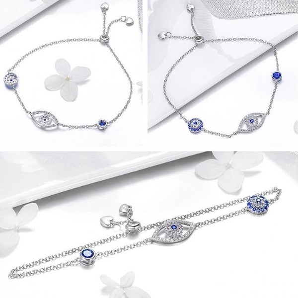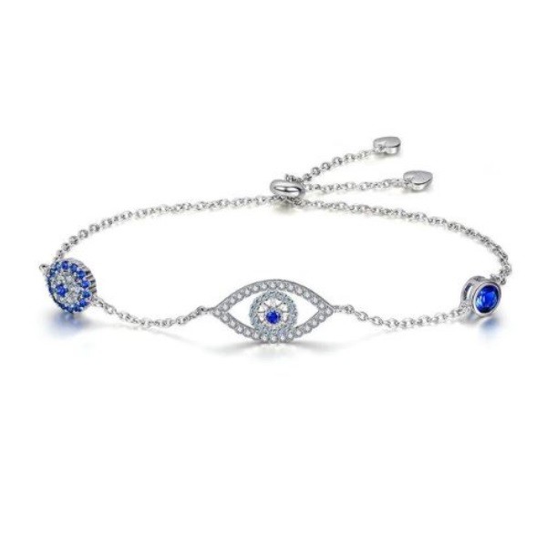 Filigránsky strieborný náramok s motívom čertovských očí zdobený modrými a bielymi kryštálmi zirkónu. Dĺžka náramku je 22 cm.