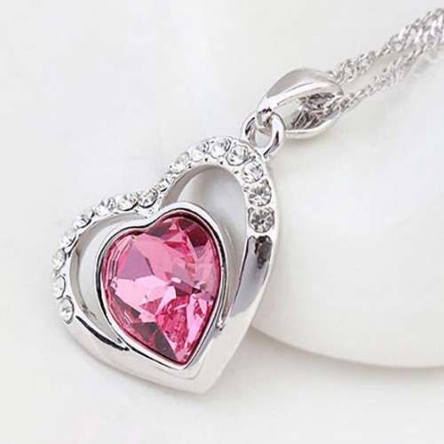 Srdiečko s kamienkami Swarovski v ráme striebornej farby v tvare srdca. Dĺžka retiazky je 40 + 5 cm, materiál je zliatina zinku a medi. Veľkosť prívesku je 3,0 x 1,8 cm. Váži 9,10 g.
