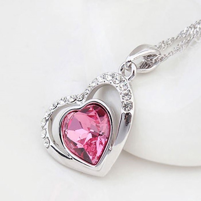 Náhrdelník striebornej farby, v srdci zdobený zirkónovými kryštálmi, s farebným príveskom kryštál Swarovski v tvare srdca. Veľkosť prívesku je 3,0 x 1,8 cm, dĺžka retiazky je 40 + 5 cm. Materiál: zliatina zinku, meď. Hmotnosť: 9,10 g.