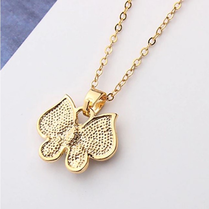 Náhrdelník zlatej farby s príveskom motýľa, ktorého stred zdobí farebný kryštál Swarovski. Veľkosť prívesku je 1,9 x 2,0 cm, dĺžka retiazky je 40 + 5 cm. Materiál: zliatina zinku, meď. Hmotnosť: 7,70 g.