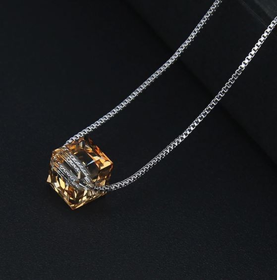 Náhrdelník s príveskom v tvare kocky z kryštálov Swarovski. Materiál retiazky je zliatina zinku a medi. Veľkosť prívesku je 0,8 x 0,8 cm. Váži 7,30 g.