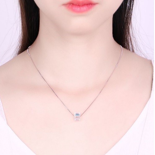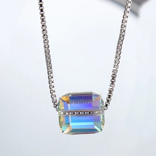 Náhrdelník s príveskom v tvare kocky z kryštálov Swarovski. Materiál retiazky je zliatina zinku a medi. Veľkosť prívesku je 0,8 x 0,8 cm. Váži 7,30 g.