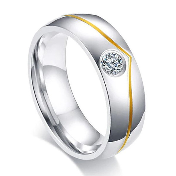 Dámsky snubný prsteň vyrobený z nerezovej ocele, s ozdobným vzorom zlatej farby, zirkónový kryštál. Šírka 6 mm, hrúbka 2 mm, váha 4 g Snubný prsteň je vyrobený z pevnej nerezovej ocele. Jeho farba je 100% odolná voči opotrebovaniu