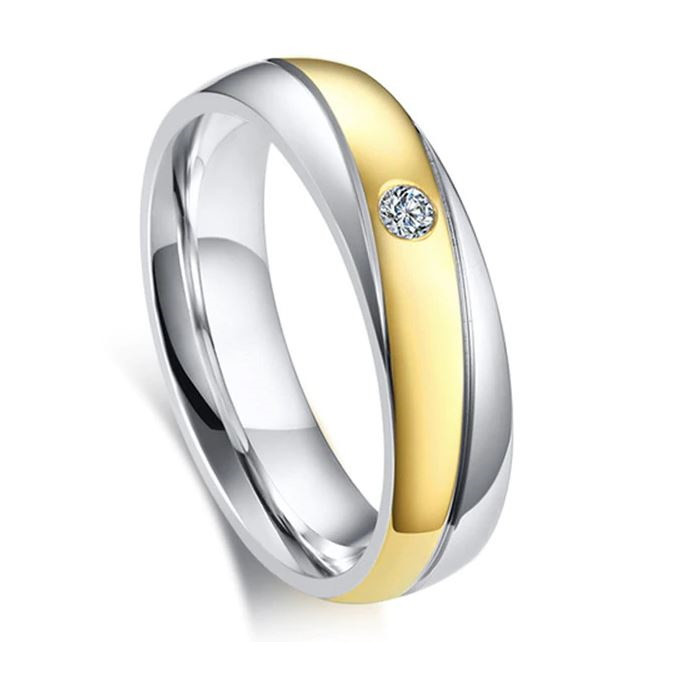 Dámsky svadobný prsteň vyrobený z nehrdzavejúcej ocele, zdobený pozláteným pásikom a bielym zirkónovým kryštálom. Šírka 5 mm, hrúbka 2 mm, hmotnosť 4 g Snubný prsteň je vyrobený z masívnej nehrdzavejúcej ocele. Jeho farba je 100% odolná voči opotrebovaniu