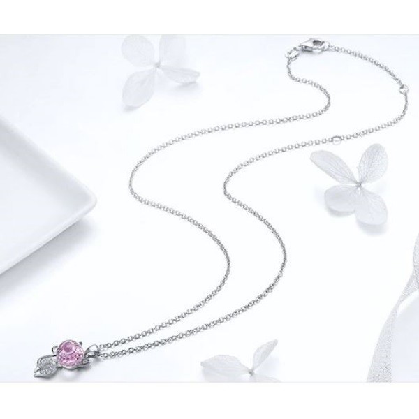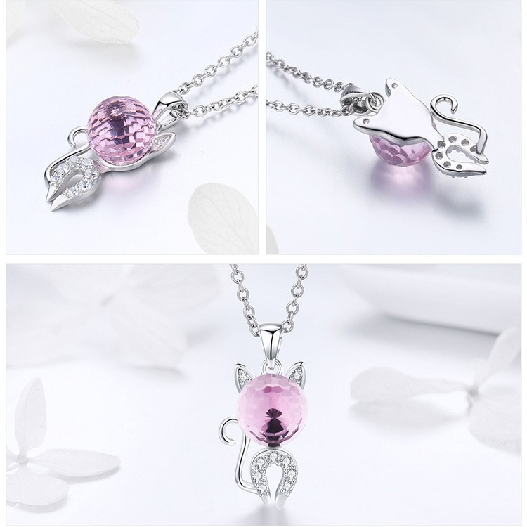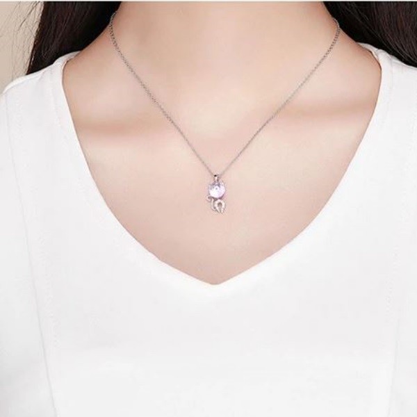 Strieborný náhrdelník, na ktorom visí malý prívesok mačičky z ružového skla a bieleho zirkónového kryštálu Dĺžka retiazky je 37,5-46 cm, veľkosť prívesku je 2,1 x. 0,9 cm.