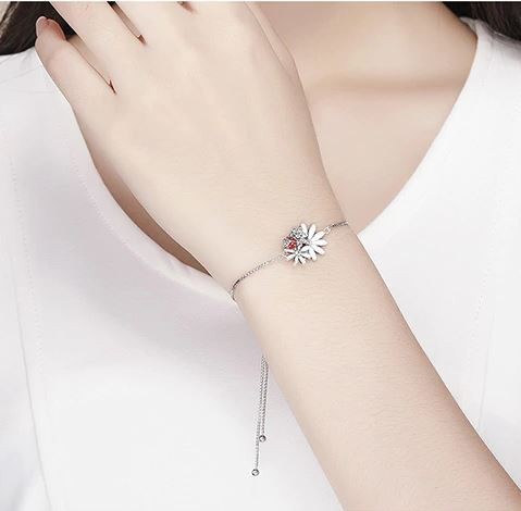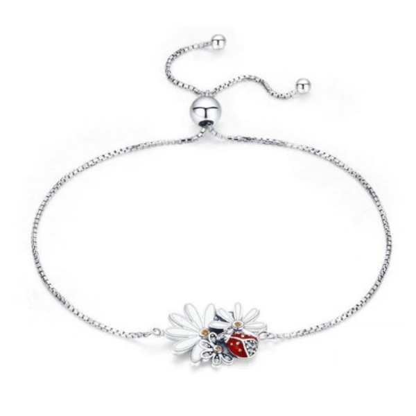 Strieborný náhrdelník s pôvabným príveskom zobrazujúcim margarétky a lienku. Dĺžka retiazky je 22 cm, prívesok je vyrobený zo zirkónového kryštálu, rozmer 1,5 x 2,1 cm.