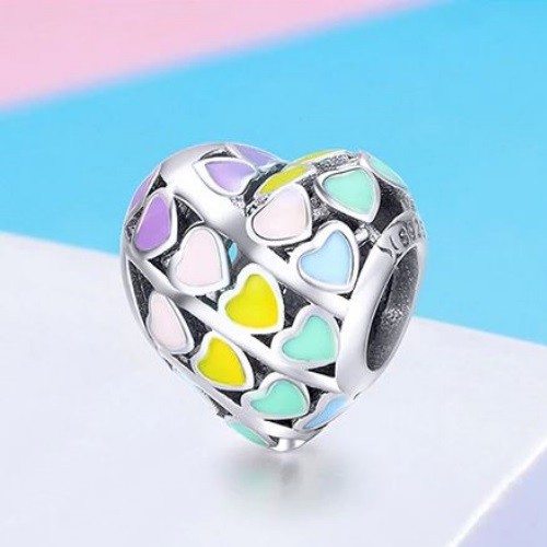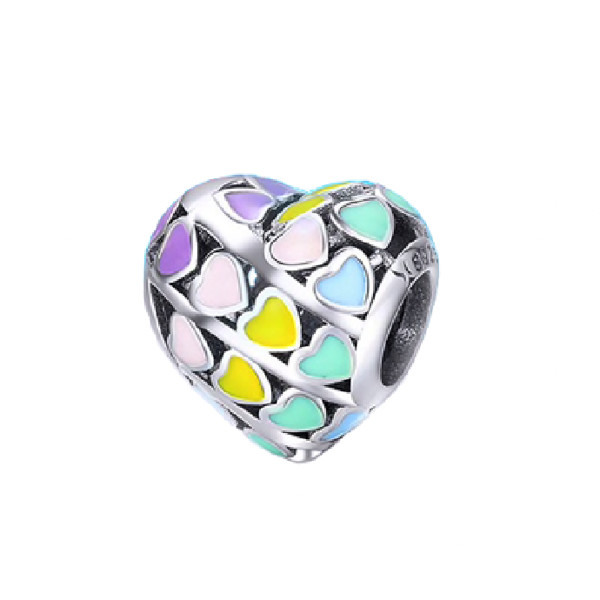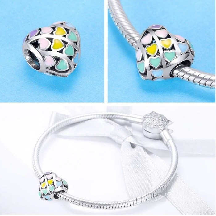 Srdiečkové srdiečko zdobené farebnými smaltovanými srdiečkami, vyrobené zo striebra. Na náramok, náhrdelník. Váži 1,7 g.