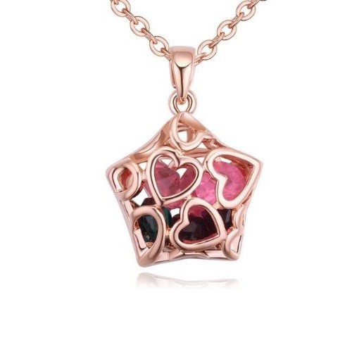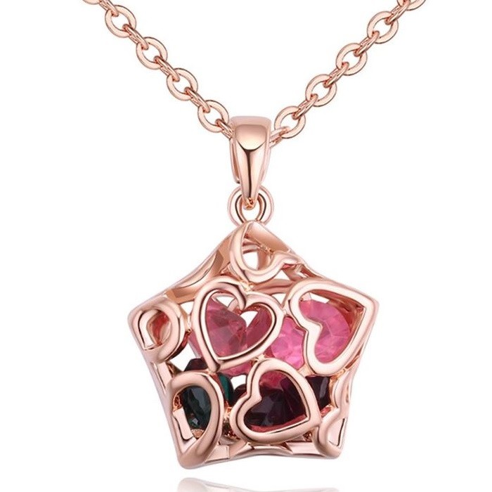 Náhrdelník s elegantným príveskom v tvare ažúrovej hviezdy, vo vnútri s drobnými českými kryštálmi. Veľkosť prívesku je 1,6 x 2,2 cm, dĺžka retiazky je 40 + 5 cm. Materiál: zliatina zinku, meď. Hmotnosť: 8,90 g.