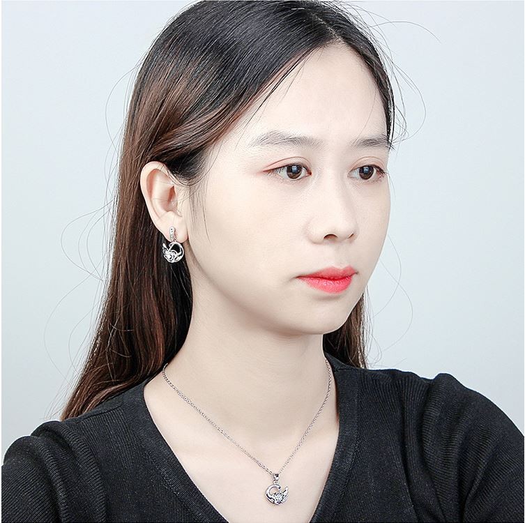 Náhrdelník striebornej farby s príveskom labuť a zladenými náušnicami, zdobený farebnými kryštálmi Swarovski.