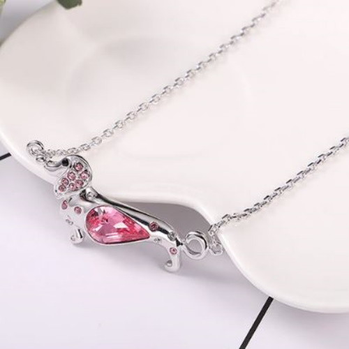 Náhrdelník striebornej farby so správnym príveskom jazvečíka. Prívesok je zdobený kryštálom Swarovski, rozmer 4,4 x 1,8 cm. Dĺžka retiazky je 40-45 cm.