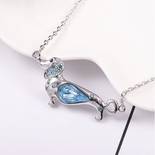 Náhrdelník striebornej farby so správnym príveskom jazvečíka. Prívesok je zdobený kryštálom Swarovski, rozmer 4,4 x 1,8 cm. Dĺžka retiazky je 40-45 cm.