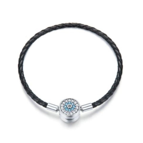 Náramok vyrobený zo striebra a umelej kože zdobený modrými a bielymi kryštálmi zirkónu. Dĺžka 19 cm, veľkosť zapínania 1,1 × 1,1 cm.