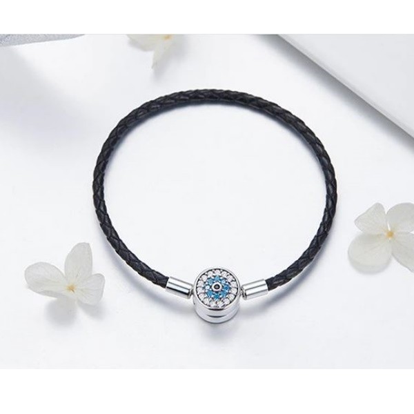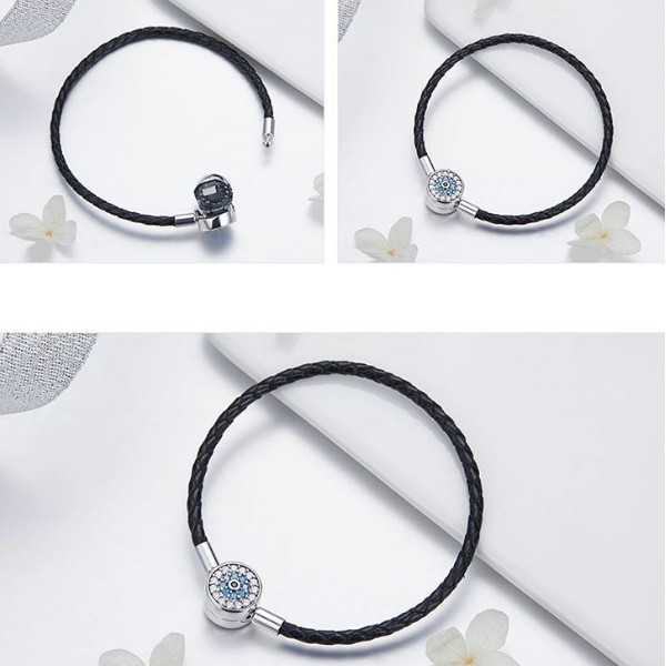 Náramok vyrobený zo striebra a umelej kože zdobený modrými a bielymi kryštálmi zirkónu. Dĺžka 17 cm, veľkosť spony 1,1 × 1,1 cm.