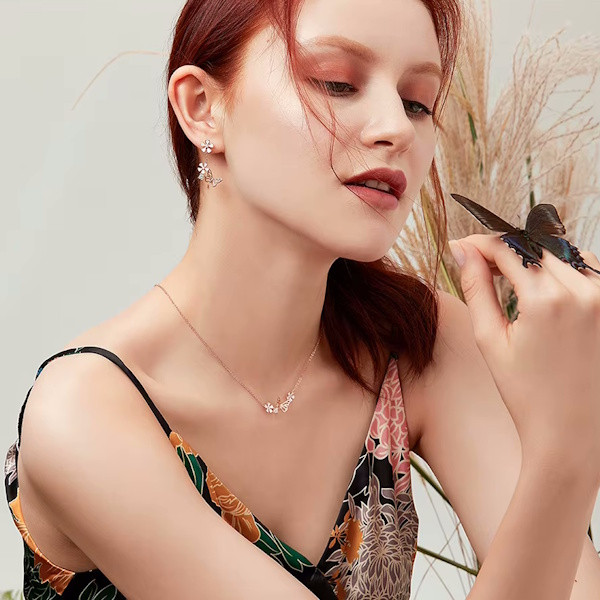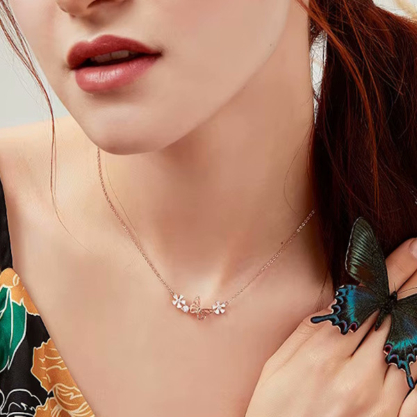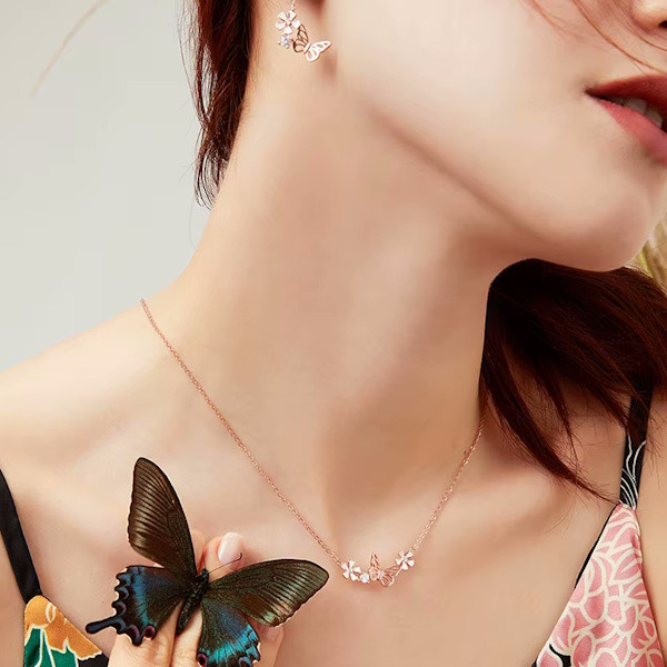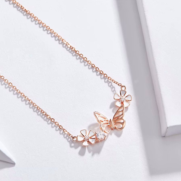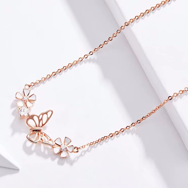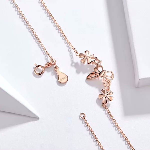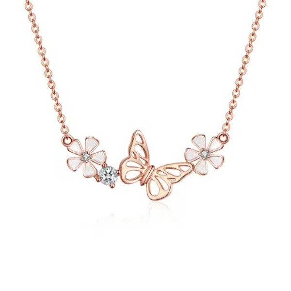 Ez a lenyűgöző 925 sterling ezüst nyaklánc rózsaarany-bevonattal és csillogó cirkóniumkristállyal kápráztat el mindenkit, aki csak rápillant. A finom, 45 cm hosszú lánc tökéletesen öleli körül a nyakat, míg a légies pillangó függő, melynek mérete 1.2×2.9 cm, elegáns és időtlen megjelenést kölcsönöz. A pillangó motívum az átalakulás és a megújulás szimbóluma, emlékeztetve viselőjét az élet szépségeire és az új kezdetek lehetőségére. A könnyed, 2.7 g súlyú ékszer ideális választás mindennapi viseletre, de különleges alkalmakra is. Ajándéknak is kiváló, hiszen a pillangó univerzális jelképe minden nő szívét megdobogtatja. Lepd meg szerettedet ezzel a különleges nyaklánccal, amely nemcsak stílusos, hanem mélyebb jelentéssel is bír.