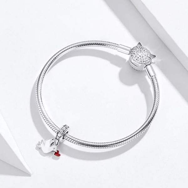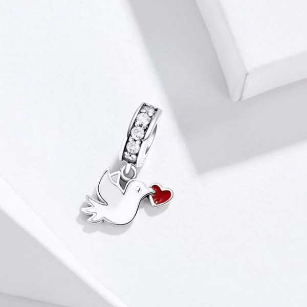 Strieborný prívesok holubica so srdiečkom v zobáku, zdobený zirkónovým kryštálom. Jeho rozmer je 1,8 x 1,2 cm.