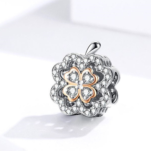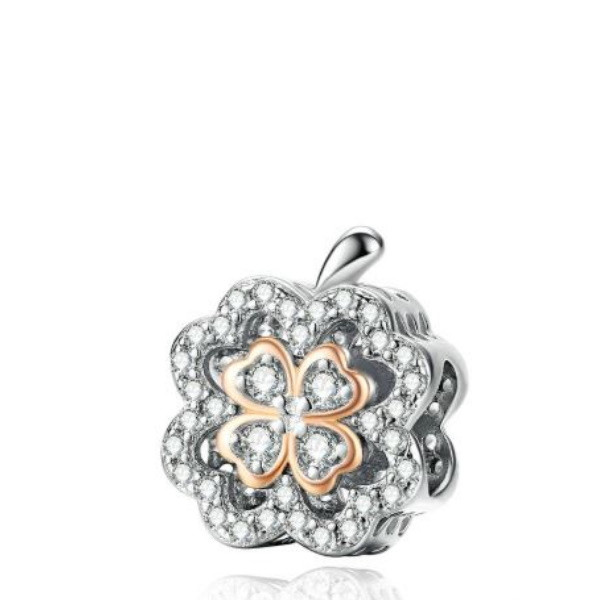 Český krištáľ zdobený, strieborný prívesok náramok alebo náhrdelník. V strede je ružovozlatý motív ďateliny. Veľkosť 1 x 1,2 cm, hmotnosť cca. 2 g.