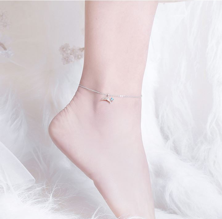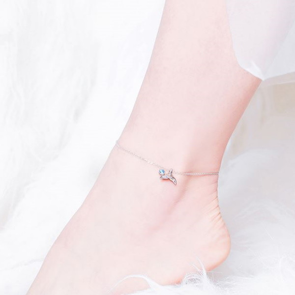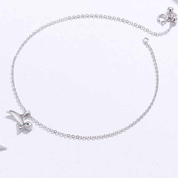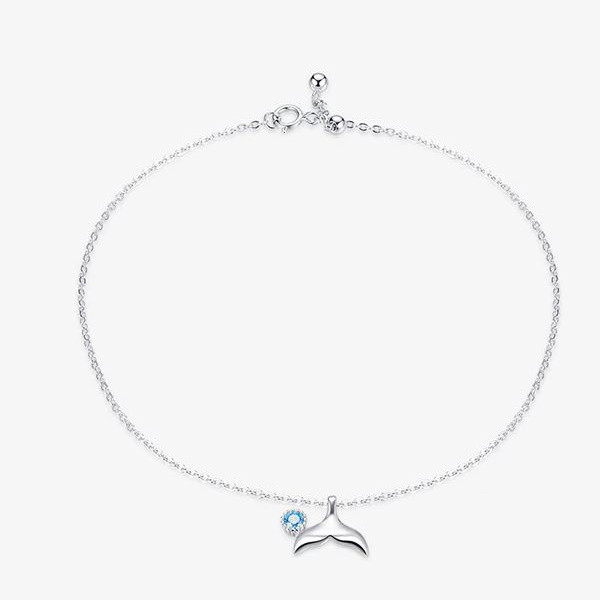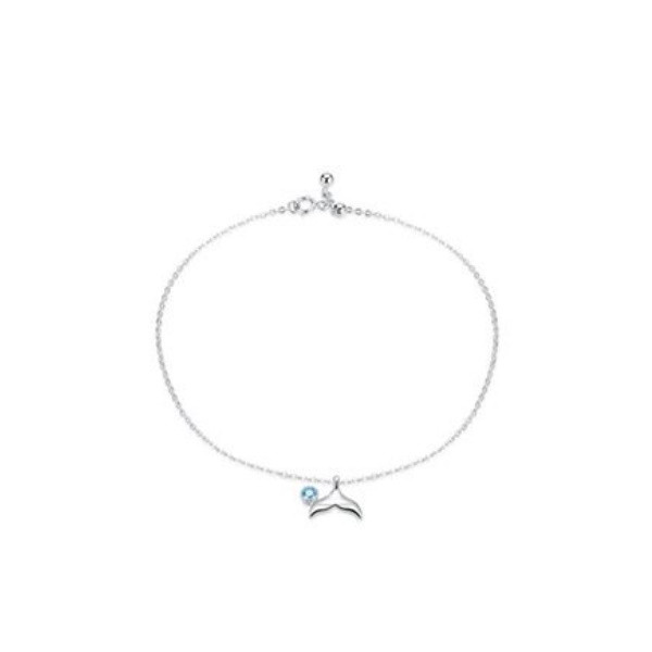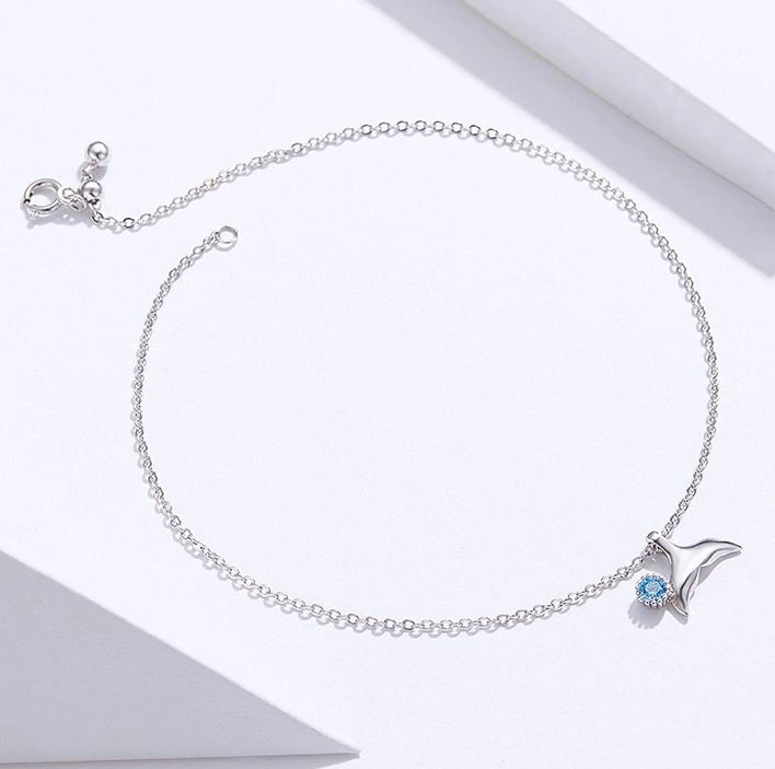 Strieborný náramok s platinovým povlakom, prívesok rybieho chvosta, zdobený drobnými modrými kryštálmi zirkónu. Dĺžka 23 cm, váha 1,3 g.
